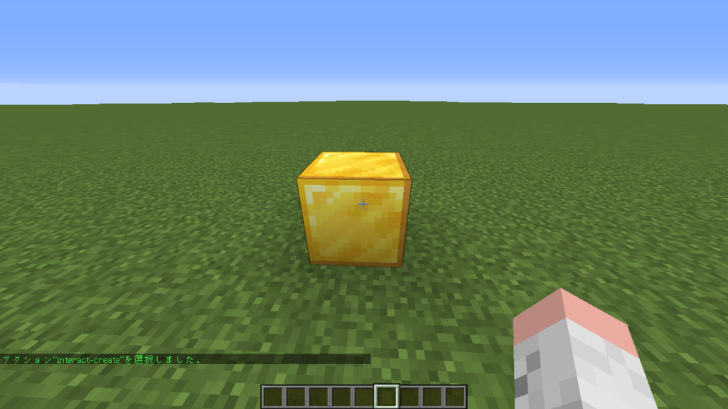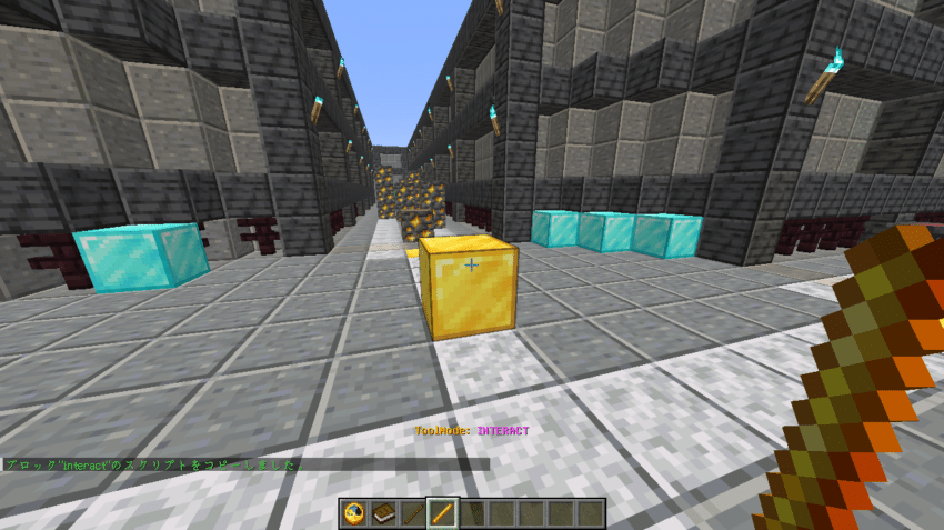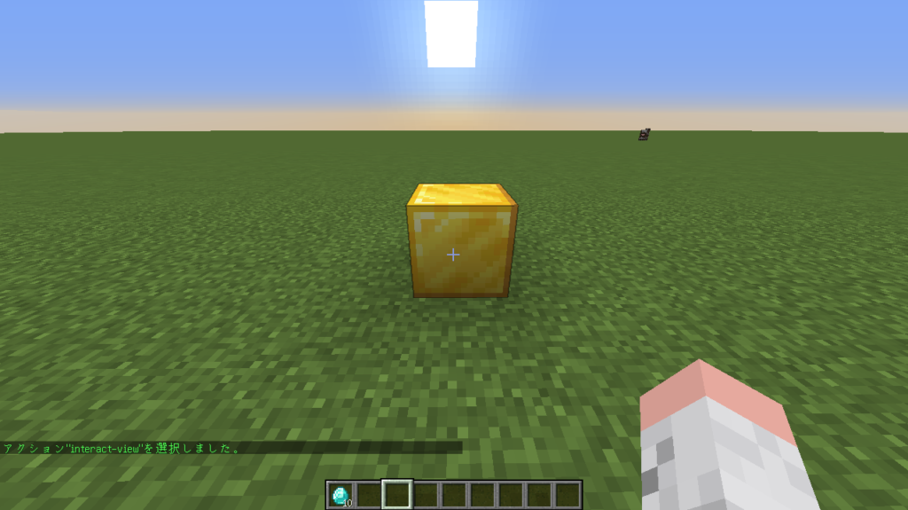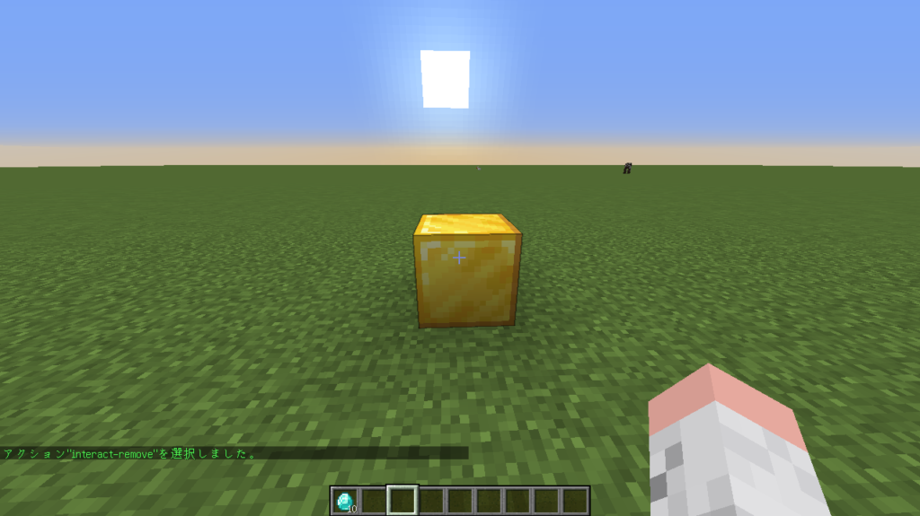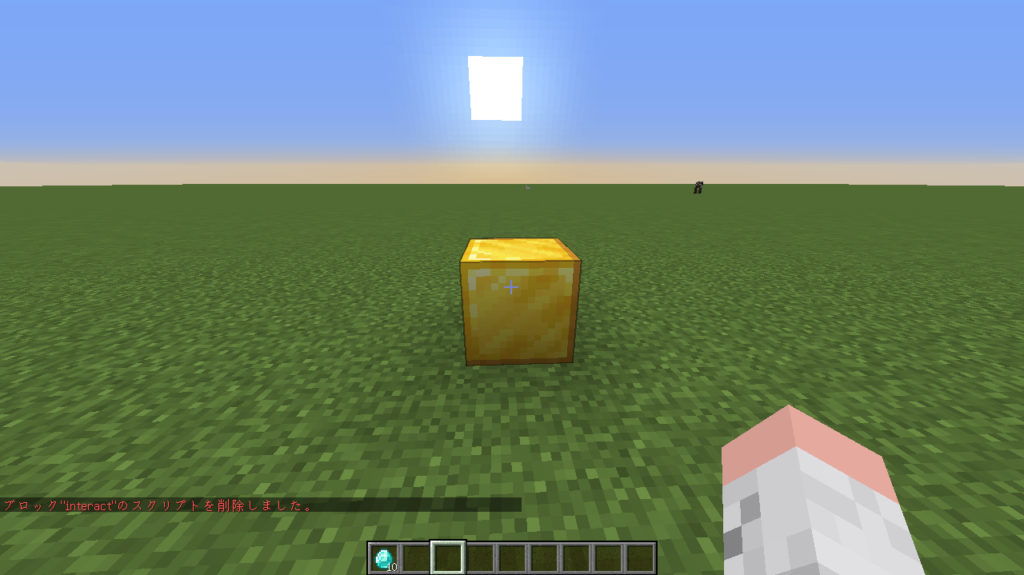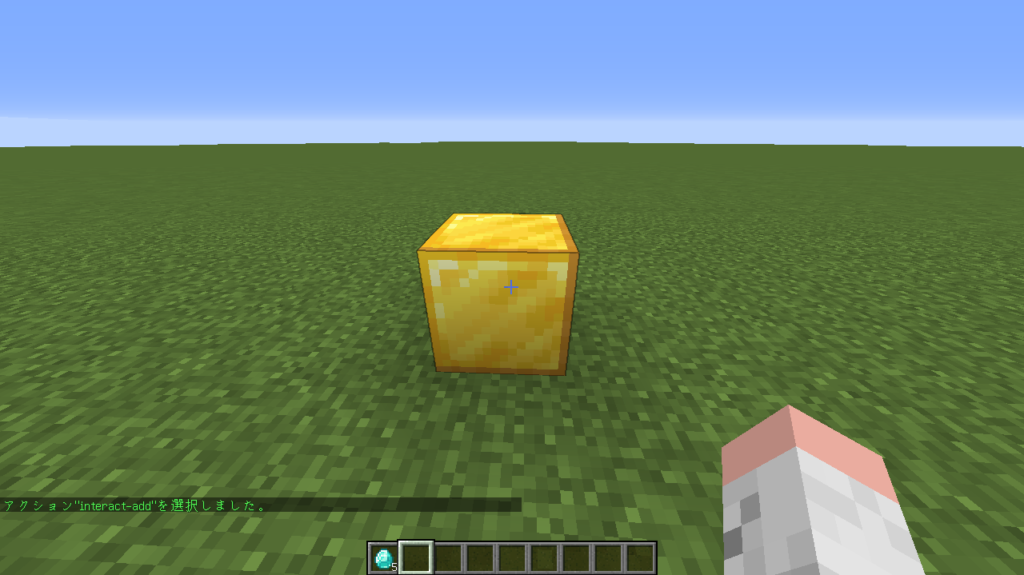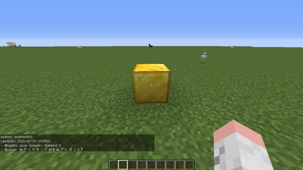 スクリプトを埋め込んだブロックをクリックすると「ダイヤモンドが5個貰え、ダイヤモンドをプレゼント!」というメッセージが表示されたと思います!