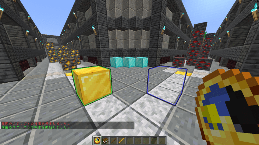 表示を有効にすると、周囲のブロックに対し、埋め込み済みのスクリプトブロックが緑色の発光パーティクル、埋め込み済みの空気ブロックに青色の発光パーティクルが表示されます。