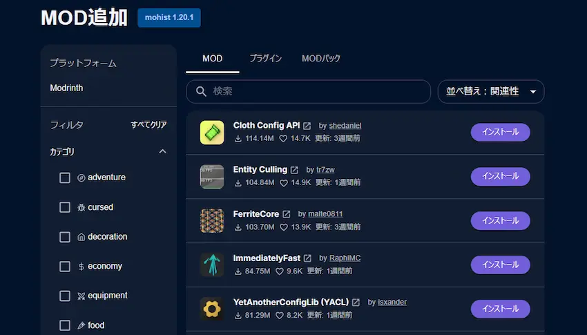 MOD配布サイトのModrinthから直接取得しているため、使い勝手が非常に良いです!