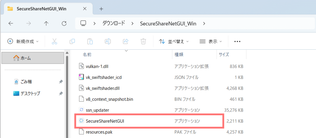 SecureShareNetGUI.exeはこのフォルダから取り出すとエラーの原因になるため、取り出さないでください。SecureShareNetGUI.exeのショートカットを作成すると取り出せます。
