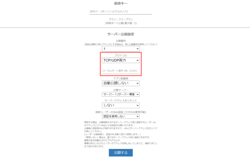 赤枠で囲まれた「ローカルポート番号」にマイクラサーバーのポート番号を入力します。