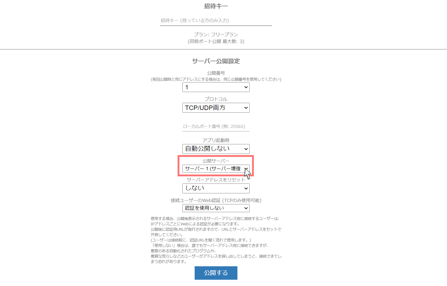 公開に使用するサーバーを選択できます。