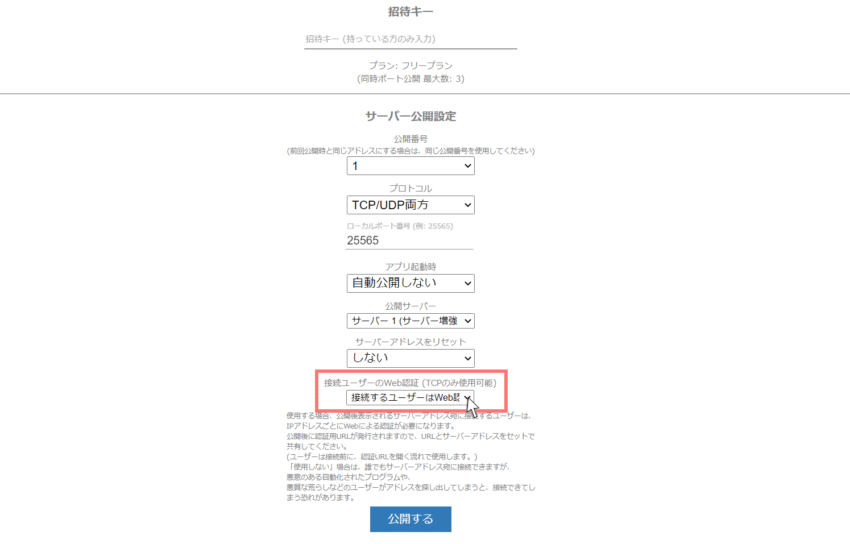 Web認証とは、このままサーバー公開すると、誰でもサーバーに接続できる状態になっており、悪意あるアプリや荒らしプレイヤーが接続できてしまうため、それらを防止できる設定です。(ホワイトリストのようなもの)