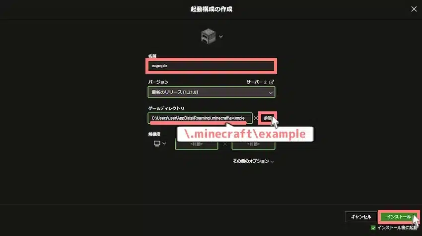 分かりやすく名前に「example」と名付けて、ゲームディレクトリの「参照」をクリックして、「.minecraft」フォルダを指定して、フォルダパスの末尾に「\example」を付け足してください。(\は?の右隣のキー)