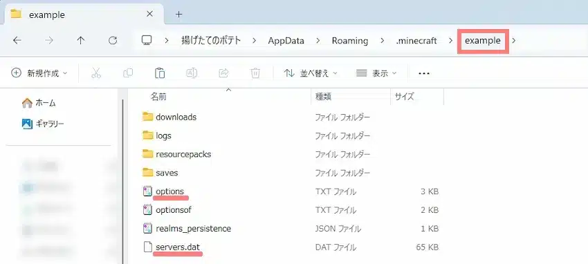 このように、「options.txt」と「servers.dat」をexampleフォルダにコピーしました。