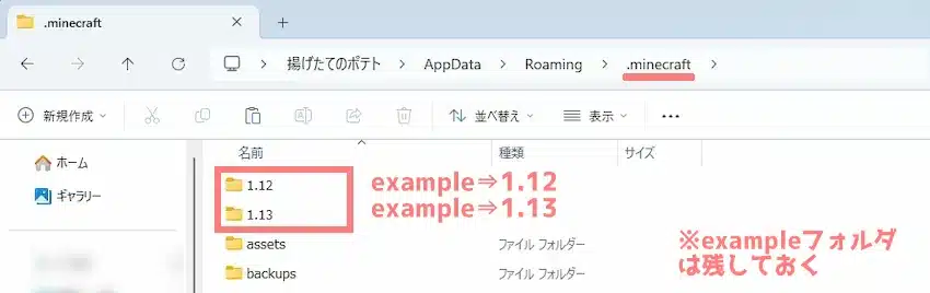 最後に、作成した仮のゲームディレクトリ(example)を複製して、「1.12」と「1.13」にそれぞれ名付けます。