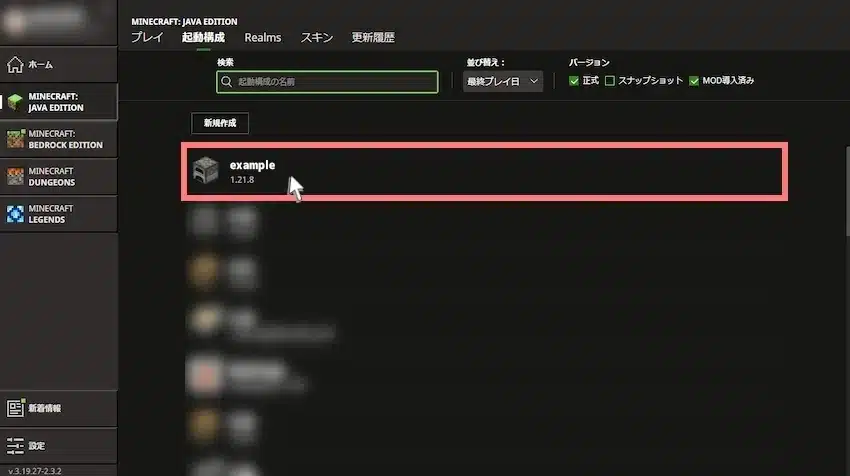 マイクラランチャーを開き、「起動構成」をクリックします。