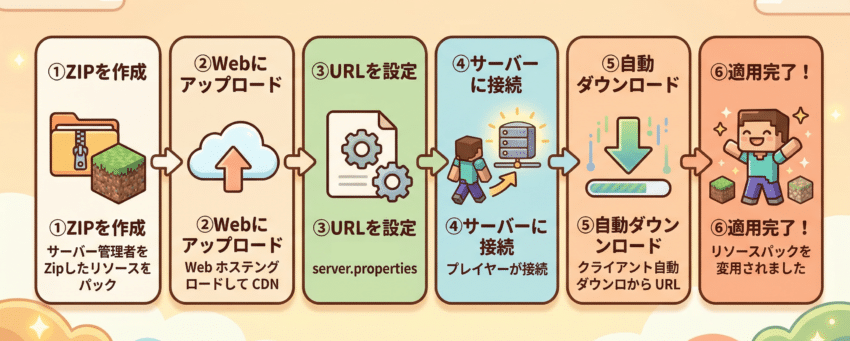 そのため、マイクラサーバーでは、「サーバーリソースパック」という仕組みがあり、これを使えば、サーバーに接続すると自動的にリソースパックが反映されるようになります。