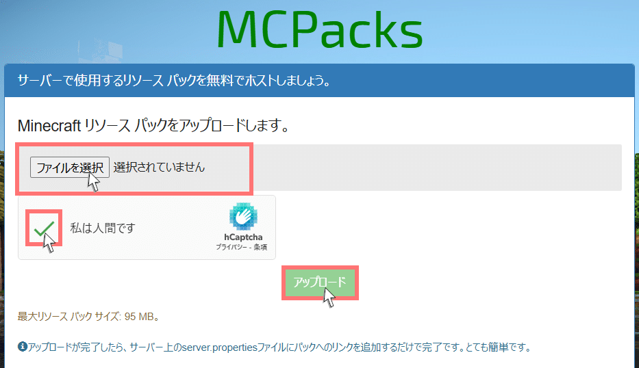 また、1ファイルあたり最大95MBとなっており、通常のリソースパックであれば十分に使えます。登録や支払いも一切不要で、誰でも簡単に使えます。
