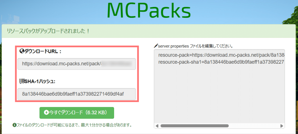 特徴として、ZIP形式のリソースパックをサイトにアップロードするだけで、サーバー設定ファイル(server.properties)に記述するために必要な「リソースパックURL」と「SHA-1ハッシュ値」が生成されます。