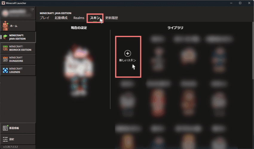 Minecraft Launcherを起動して、「スキン」タブを開き、「新しいスキン」をクリックします。