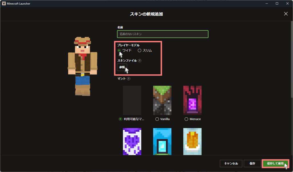 プレイヤーモデルとスキンファイルを選択できたら、右下の「保存して使用」をクリックします。