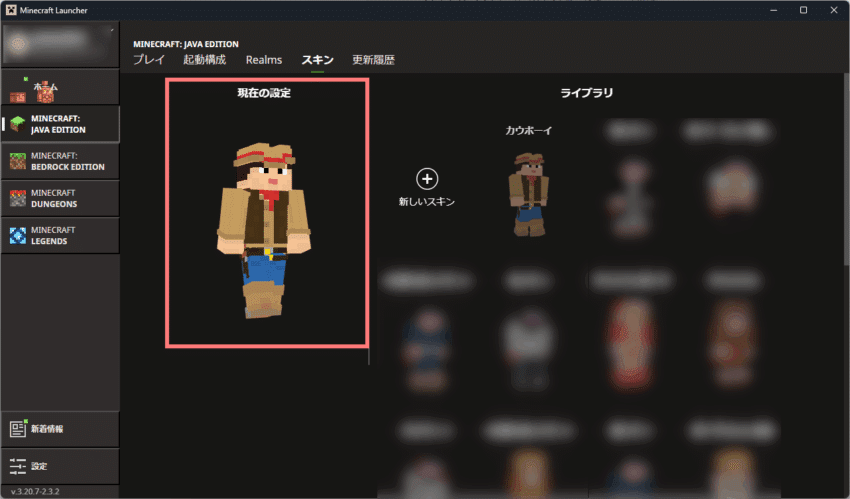 ランチャーはいつもマインクラフトを起動するために使っていると思いますが、もう1つの機能としてスキンを変更できる機能があります!