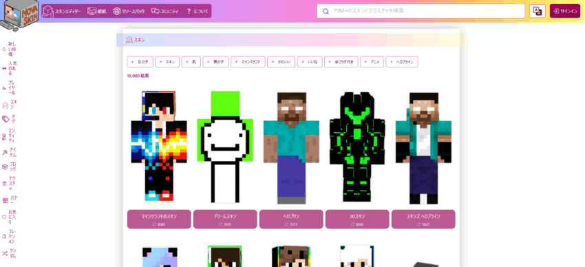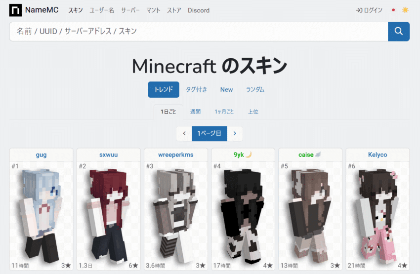 NameMC NameMCは、プレイヤー情報やスキン情報を検索・表示できるサイトです。豊富なスキンが保存されているため、気に入ったスキンからダウンロードすることができます。