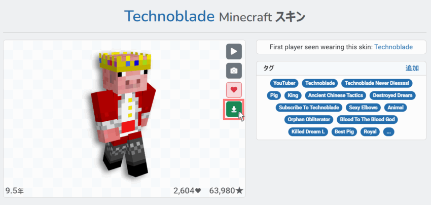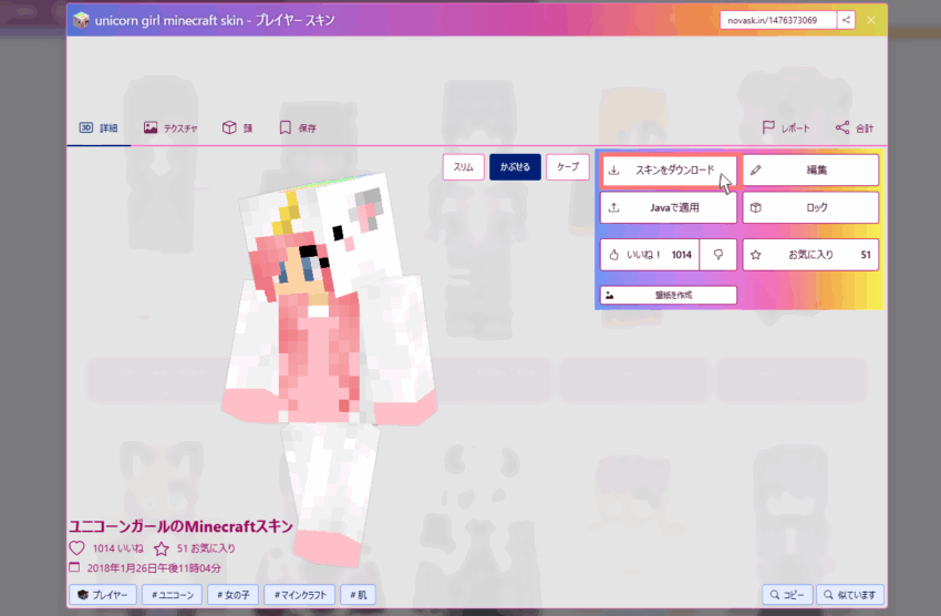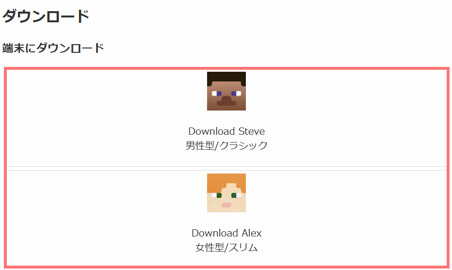 使いたいスキンをクリックすると、スキンの詳細情報が表示されるので、下部にある「Download Steve(ワイド型)」または「Download Alex(スリム型)」をクリックするとスキンデータがダウンロードされます。