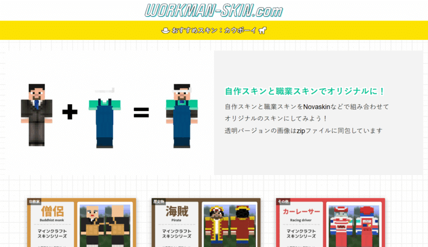 WORKMAN-SKIN.comは、様々な職業服をスキンで再現していて、コンビニ店員や作業員、警察官、宇宙飛行士など多種多様な職業服スキンを揃えています。